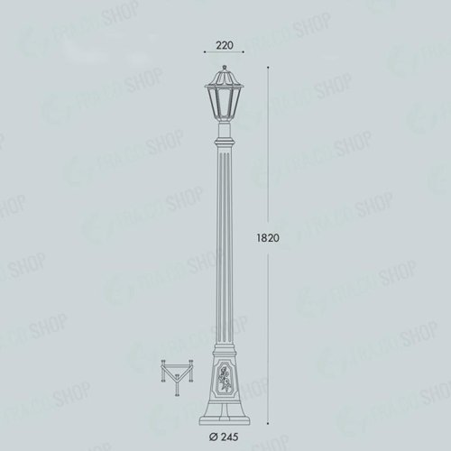 Lanterna esagonale E27 in stile classico, realizzata in resina antiurto, stabilizzata ai raggi UV, inattaccabile da ruggine e corrosione. Idonea per il montaggio a palo. Fornita anche completa di lampadine LED E27. Classe di isolamento II, grado di protezione IP55.DIMENSIONI: .larghezza: 220mm altezza: 1820mmMATERIALE: .resina (corpo), PMMA (diffusore)PESO: .9000grLAMPADA: .E27INSTALLAZIONE: .viale, giardino:Scheda tecnica=Clicca Qui