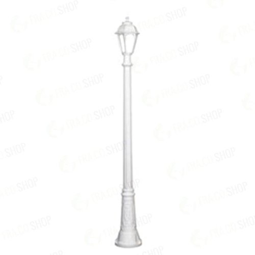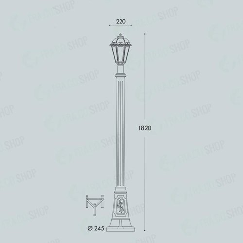 Lanterna E27 in stile classico, realizzata in resina antiurto, stabilizzata ai raggi UV, inattaccabile da ruggine e corrosione. Idonea per il montaggio a palo. Fornita anche completa di lampadine LED E27. Classe di isolamento II, grado di protezione IP55.DIMENSIONI: .larghezza: 220mm altezza: 1820mmMATERIALE: .resina (corpo), PMMA (diffusore)PESO: .9000grLAMPADA: .E27INSTALLAZIONE: .viale, giardino