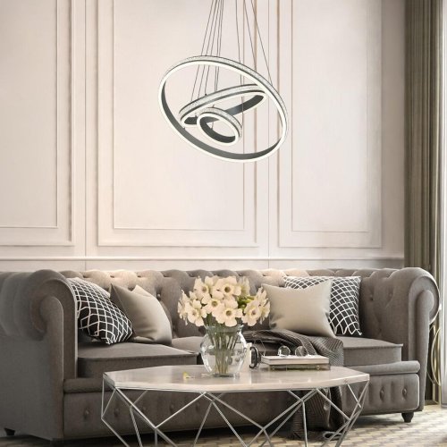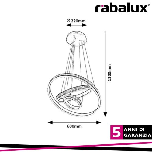 Sospensione Avalon.La sospensione minimalista Avalon sarà un'aggiunta spettacolare all'arredamento del tuo soggiorno, sala da pranzo o camera da letto. L'apparecchio in metallo color alluminio spazzolato è completato da paralumi in acrilico bianco e la lampada può essere fissata al soffitto con l'aiuto di una base decorativa rotonda. L'Avalon ha un carattere interessante grazie ai suoi elementi a forma di anello di varie dimensioni che sono decorati da ornamenti di cristallo intorno. Questa plafoniera contiene una sorgente luminosa LED integrata con una potenza di 75W, un flusso luminoso di 4730 lumen e una durata di 20.000 ore. La lampadina con una temperatura di colore di 4.000K irradia luce bianca naturale. Le dimensioni della sospensione Avalon sono le seguenti: diametro 600mm, distanza dal soffitto 1300mm, diametro installazione 220mm. Su questo eccellente modello offriamo una garanzia di 5 anni.CARATTERISTICHE DEL PRODOTTO:Categoria di prodotto=Illuminazione interna:Tipo=Pendenti:Stile=Minimo:Camera=soggiorno, sala da pranzo, camera da letto:Flusso luminoso della sorgente luminosa (lm)=4730:Specifiche della sorgente luminosa=75W:Tecnologia LED=SÃ:Protezione IP=IP20:Colore della lampada=alluminio spazzolato:Materiale della lampada=metallo:Materiale del paralume=acrilico:Durata della sorgente luminosa (h)=20000:Classe energetica sorgente luminosa=G:Garanzia (anni)=5:Consumo energetico ponderato (kwh/1000 Ah)=75,0:Specifiche dell'apparecchio di illuminazione=LED 75W:Tensione applicata=230V, 50Hz:Distanza dal soffitto=1300,0:Diametro=600,0:Misura scatola unica X (cm)=66,0:Misura scatola unica Y (cm)=66,0:Peso netto (kg)=4.0:Peso lordo=4.3:Temperatura colore (K)=4000:Dimensioni installazione (mm)=220MM:Classe di protezione=I
