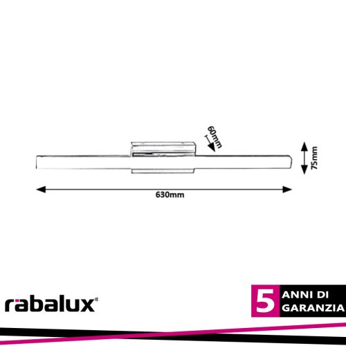 Lampada bagno.La lampada da parete per il bagno Bastian sarà un'ottima aggiunta al tuo moderno bagno: se montata sopra il lavandino o sopra lo specchio, emana una luce bianca naturale nella stanza, creando un effetto pulito e moderno. La lampada Bastian color cromo ha una sorgente luminosa LED integrata a risparmio energetico con una potenza di 13 W, un flusso luminoso di 1120 lumen e una durata di 20.000 ore. La temperatura di colore della sorgente luminosa è di 4000 K. La lampada da parete in metallo e plastica ha una protezione IP44, che assicura che sia protetta contro la penetrazione di oggetti con un diametro massimo di 1 mm e contro gli schizzi d'acqua da qualsiasi direzione. La lampada ha le seguenti dimensioni: lunghezza 630 mm, altezza 75 mm, distanza dalla parete 60 mm. La lampada da bagno Bastian è dotata di una garanzia di 5 anni.Caratteristiche del prodotto:Categoria di prodotto0Illuminazione interna:Tipo=Luci del bagno:Stile=Moderno:Camera=bagno:Temperatura del colore=bianco naturale:Flusso luminoso della sorgente luminosa (lm)=1120:Specifiche della sorgente luminosa=13W:Tecnologia LED=SÃ:Protezione IP=IP44:Colore della lampada=cromo:Materiale della lampada=metallo:Materiale del paralume=plastica:Durata della sorgente luminosa (h)=20000:Garanzia (anni)=5:Consumo energetico ponderato (kwh/1000 Ah)=13.0:Specifiche dell'apparecchio di illuminazione=LED 13W:Tensione applicata=230V, 50Hz:Distanza dal muro=60.0:Orizzontale (mm)=630.0:Verticale (mm)=75.0:Misura unica della scatola X (cm)=8.5:Misura unica della scatola Y (cm)=7.7:Misura unica della scatola Z (cm)=65.0:Peso netto (kg)=0,54:Peso lordo=0,76:Temperatura del colore (K)=4000:Wifi=NO:Classe di protezione=I