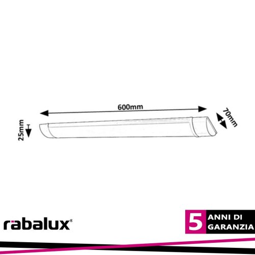 Lampada per interno.La luce da armadio Rábalux Batten Light 2 è la scelta ideale per chi cerca una soluzione di illuminazione moderna e salvaspazio per la cucina. Come ogni casalinga â e cuoco â sa, una buona illuminazione è fondamentale durante la preparazione dei pasti. Nelle aree ombreggiate dai mobili della cucina, questo può essere realizzato al meglio utilizzando una luce da armadio. L'intensità luminosa di questo modello lo rende anche un aiuto efficace per compiti che richiedono precisione. La lampada è realizzata in plastica bianca, in uno stile funzionale. à dotata di una sorgente luminosa LED integrata che emette una luce bianca naturale â il tipo ideale di luce per il lavoro in cucina. La tecnologia LED garantisce un funzionamento efficiente dal punto di vista energetico e una lunga durata della luce da armadio.Caratteristiche del prodotto:Categoria=Luci per interni:Tipo=Illuminazione del mobile:Stile=Funzionale:Tipologia di camera consigliata=cucina:Temperatura del colore=bianco naturale:Flusso luminoso della sorgente luminosa (lm)=1800:Specifiche della sorgente luminosa=18W:Tecnologia LED=sì:Protezione IP=IP20:Colore della lampada=bianco:Materiale della lampada=plastica:Colore del paralume=bianco:Materiale del paralume=plastica:Durata della sorgente luminosa (h)=25000:Classe energetica della sorgente luminosa=F:Garanzia (anni)=5:Consumo energetico ponderato (kwh/1000 Ah)=18.0:Specifiche dell'apparecchio di illuminazione=LED 18W:Tensione applicata=230V, 50Hz:Distanza dal soffitto=25.0:Orizzontale (mm)=600.0:Verticale (mm)=70.0:Misura unica della scatola X (cm)=8.0:Misura unica della scatola Y (cm)=3.5:Misura unica della scatola Z (cm)=62.0:Peso netto (kg)=0.148:Peso lordo=0.246:Temperatura del colore (K)=4000:Wi-Fi=no:Classe di protezione=II:Flusso luminoso della sorgente luminosa=1980
