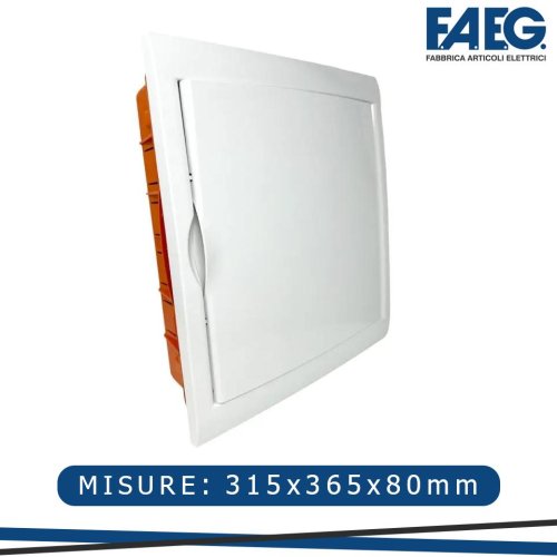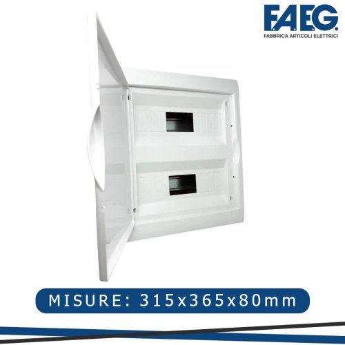 Centralino da incasso 24 moduli con cornice e portello bianco 315x365x80mm IP40 FAEG - FG14624.Centralino da incasso per 24 moduli con cornice bianca e portello bianco. Con guida DIN, materiale tecnopolimero isolante non propagante la fiamma e sportello in policarbonato.SPECIFICHE::Modello= FG14624:Dimensioni= 315x365x80mm:Moduli= 24:Materiale= policarbonato e tecnopolimero non propagante la fiamma:Potenza dissip. W= 35:Glow Wire Test= 650 °C:Ball Pressure Test= 70°C:Impact test= IK07:Temperatura di installazione= -5°C+60°C:Grado di protezione= IP40:Standard= CEI EN 60670-1/CEI EN 60670-24:Guida DIN= in acciaio zincato :Colori= Cornice bianca/portello BIANCO