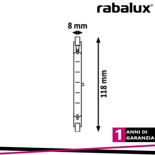 Lampadina alogena 120WCARATTERISTICHE DEL PRODOTTO:categoria di prodotto=Lampadina:Tipo=Lampadine alogene:Temperatura colore=bianco caldo:Flusso luminoso della sorgente luminosa (lm)=2220:Specifiche della sorgente luminosa=120 W:Tecnologia LED=No:Protezione IP=IP20:Durata della sorgente luminosa (h)=2000:Classe energetica sorgente luminosa=G:Angolo di illuminazione=360:Consumo energetico ponderato (kwh/1000 Ah)=120.0:PRESA=R7:Tensione applicata=AC 220-240V:Verticale (mm)=118.0:Diametro=8.0:Dimensioni scatola unica X (cm)=2.0:Dimensioni scatola unica Y (cm)=2.0:Dimensioni scatola unica Z (cm)=13.0:Peso netto (kg)=0,012:Peso lordo=0,016:Dimmerabile=sì