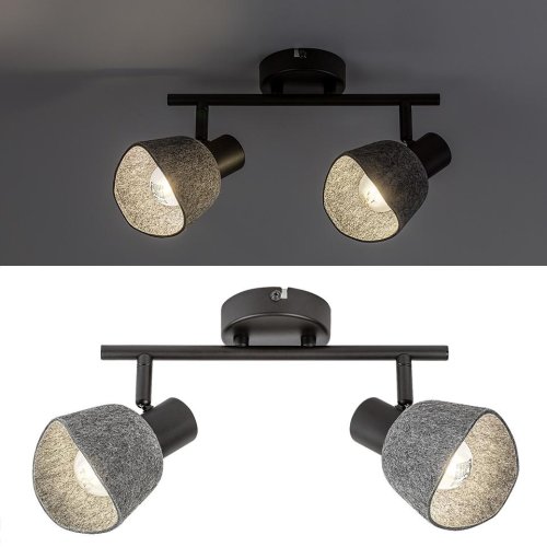 Applique a muro.Il faretto da soffitto a 2 luci Rábalux Farelia è consigliato a chi ama le lampade dal design originale che contribuiscono a creare unâatmosfera accogliente. Questo modello è realizzato in metallo nero con paralumi in feltro grigio. Il materiale del paralume è in feltro ecologico, prodotto con materiali riciclati. La lampada può essere fissata al soffitto tramite una piccola base decorativa rotonda, alla quale è collegata una barra cilindrica che sostiene le testate delle lampade. La forma curva dei paralumi a campana, abbinata al morbido materiale in feltro, conferisce alla lampada un aspetto piacevole e accogliente. à la scelta ideale per il soggiorno, la camera da letto o lo studio. Può essere utilizzata con due fonti luminose, ciascuna con una potenza massima pari a 10 W. Il tipo di attacco è E14. Il faretto a 2 luci è dotato di testate flessibili e pratiche. La lampada viene fornita senza sorgenti luminose.Caratteristiche del prodotto:Categoria=Luci per interni:Tipo=Lampada spot:Stile=Moderno:Tipologia di camera consigliata=soggiorno, camera da letto, stanza da lavoro:Protezione IP=IP20:Colore della lampada=nero:Materiale della lampada=metallo:Colore del paralume=grigio:Materiale del paralume=feltro:Sorgente luminosa inclusa=no:Numero di portalampada=2:Tipo di portalampada=E14:Specifiche dell'apparecchio di illuminazione=E14 2X MAX 10W:Tensione applicata=230V, 50Hz:Distanza dal soffitto=210.0:Orizzontale (mm)=280.0:Diametro (mm)=110.0:Misura unica della scatola X (cm)=16.0:Misura unica della scatola Y (cm)=12.0:Misura unica della scatola Z (cm)=29.0:Peso netto (kg)=0.368:Peso lordo=0.527:Wi-Fi=no:Dimensioni di installazione (mm)=90.0:Classe di protezione=I