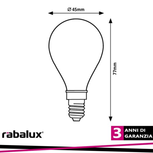 Lampadina Filamento E14 G45 4W 2700KCARATTERISTICHE DEL PRODOTTO:Categoria di prodotto=Lampadina:Tipo=P45:Temperatura del colore=bianco caldo:Flusso luminoso della sorgente luminosa (lm)=500:Specifiche della sorgente luminosa=4 W:Tecnologia LED=SÃ:Protezione IP=IP20:Colore della lampada=trasparente:Materiale della lampada=Vetro:Materiale del paralume=Vetro:Durata della sorgente luminosa (h)=20000:Classe energetica della sorgente luminosa=E:Garanzia (anni)=3:Angolo di illuminazione=300:Consumo energetico ponderato (kwh/1000 Ah)=4.0:PRESA=E14:Tensione applicata=230V , 50 Hz:Verticale (mm)=77.0:Diametro=45.0:Misura unica della scatola X (cm)=4.5:Misura unica della scatola Y (cm)=7.8:Misura unica della scatola Z (cm)=4.5:Peso netto (kg)=0,01:Peso lordo=0,02:Temperatura del colore (K)=2700:La forma della sorgente luminosa=G45:Raggio d'azione ideale="-20°C 40°