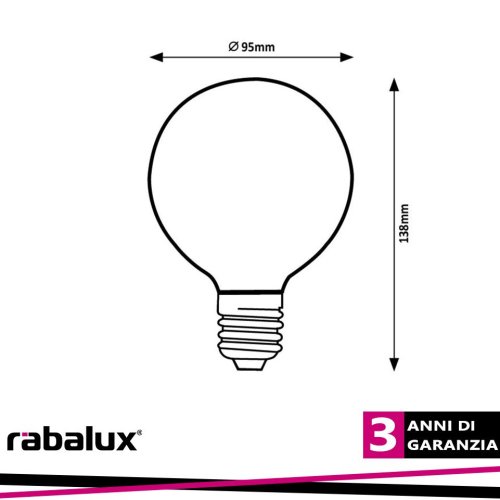 Sorgente luminosa a incandescenza.Abbiamo i tipi di attacco più diffusi, come E14, E27, GU10 e G9, disponibili in una varietà di forme e temperature di colore. Tra i tipi di LED, abbiamo lampadine intelligenti per la casa intelligente e versioni ad alto flusso luminoso, la più grande innovazione tecnologica del momento.Caratteristiche del prodotto:Categoria=Sorgenti luminose:Tipo=Filamento LED:Temperatura del colore=bianco caldo:Flusso luminoso della sorgente luminosa (lm)=2000:Specifiche della sorgente luminosa=12W:Tecnologia LED=sì:Protezione IP=IP20:Colore della lampada=trasparente:Materiale della lampada=vetro:Materiale del paralume=vetro:Durata della sorgente luminosa (h)=20000:Classe energetica della sorgente luminosa=C:Garanzia (anni)=3:Angolo di illuminazione=360:Consumo energetico ponderato (kwh/1000 Ah)=12.0:Tipo di portalampada=E27:Tensione applicata=230V, 50Hz:Verticale (mm)=138.0:Diametro (mm)=95.0:Misura unica della scatola X (cm)=10.0:Misura unica della scatola Y (cm)=10.0:Misura unica della scatola Z (cm)=14.0:Peso netto (kg)=0.061:Peso lordo=0.109:Temperatura del colore (K)=3000:Wi-Fi=no:Forma della sorgente luminosa=G95