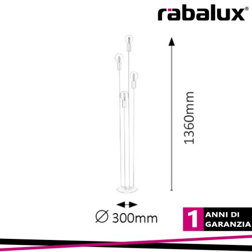 Lampada da terra.Lampada da terra in stile industriale con 4 prese. Struttura in metallo di colore nero e dorato, alta 136 cm e diametro 30 cm, con interruttore filare e protezione IP20. L'apparecchio può essere utilizzato con 4 sorgenti luminose a risparmio energetico con una potenza fino a 15W ciascuna, attacco tipo E27.CARATTERISTICHE DEL PRODOTTO:categoria di prodotto=Illuminazione interna:Tipo=Lampade da terra:Stile=Industriale:Camera=soggiorno, camera da letto:Tecnologia LED=No:Protezione IP=IP20:Colore della lampada=Nero:Materiale della lampada=metallo:Materiale del paralume=metallo:Garanzia (anni)=1:Numero di presa=4:PRESA=E27:Specifiche dell'apparecchio di illuminazione=E27 4x MAX 15W:Tensione applicata=230V, 50Hz:Verticale (mm)=1360.0:Diametro=300.0:Dimensioni scatola unica X (cm)=22.5:Dimensioni scatola unica Y (cm)=22.7:Dimensioni scatola unica Z (cm)=139.7:Peso netto (kg)=3.8:Peso lordo=4.12:Tipo=interruttore a cavo:Classe di protezione=II
