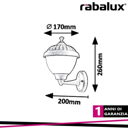Applique da esterno Modesto.Consigliamo l'applique da esterno Modesto per gli amanti dello stile tradizionale. Con la sua forma distintiva, l'apparecchio in metallo nero e il paralume in plastica bianca, questa lampada da terra crea un'atmosfera unica sulla veranda della tua casa o all'ingresso. Una base decorativa nera e rotonda completa l'applique, che evoca la forma di un candelabro. Modesto può essere utilizzato con un'unica fonte luminosa con una potenza fino a 40 W, tipo di attacco: E27. La lampada viene consegnata senza sorgente luminosa. Le dimensioni dell'illuminazione esterna sono le seguenti: diametro 170 mm, altezza 260 mm, distanza dalla parete 200 mm. La sua protezione IP44 assicura che sia protetto contro la penetrazione di oggetti con un diametro massimo di 1 mm e contro gli spruzzi d'acqua da qualsiasi direzione.CARATTERISTICHE DEL PRODOTTO:Categoria di prodotto=Illuminazione esterna:Tipo=Applique da esterno:Stile=Classico:Camera=terrazza, giardino, muro di casa:Protezione IP=IP44:Colore della lampada=Nero:Materiale della lampada=metallo:Colore del paralume=bianca:Materiale del paralume=plastica:Numero di presa=1:PRESA=E27:Specifiche dell'apparecchio di illuminazione=E27 1x MAX 40W:Tensione applicata=230V, 50Hz:Distanza dal muro=200,0:Orizzontale (mm)=170,0:Verticale (mm)=260,0:Misura scatola unica X (cm)=18.0:Dimensione scatola unica Y (cm)=21.0:Dimensione scatola unica Z (cm)=27.0:Peso netto (kg)=0.6:Peso lordo=0.7:Classe di protezione=I