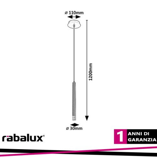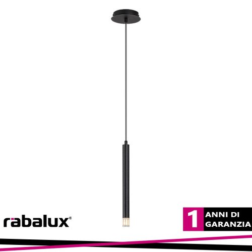 Lampada sospensione.La lampada a sospensione Rabalux Ramira è consigliata a chi cerca una lampada complementare in stile minimalista da fissare al soffitto. Dotata di una testata luminosa tubolare e cilindrica, la sospensione è realizzata in metallo nero con paralume in acrilico trasparente e una piccola base decorativa rotonda. Ã la scelta ideale per il soggiorno, la cucina, la sala da pranzo o la camera da letto. La lampada, di piccolo diametro, può essere installata ovunque sia necessaria unâilluminazione concentrata o semplicemente una soluzione luminosa dal design elegante. Per un effetto visivo più interessante, è possibile installare più modelli affiancati. Può essere utilizzata con una singola sorgente luminosa con potenza massima di 5 W, a luce bianca naturale o calda. Il tipo di attacco è G9. La lampada è fornita senza sorgente luminosa.Caratteristiche del prodotto:Categoria=Luci per interni:Tipo=Sospensione:Stile=Moderno:Tipologia di camera consigliata=soggiorno, cucina, sala da pranzo, camera da letto:Protezione IP=IP20:Colore della lampada=nero:Materiale della lampada=metallo:Colore del paralume=trasparente:Materiale del paralume=acrilico:Sorgente luminosa inclusa=no:Numero di portalampada=1:Tipo di portalampada=G9:Specifiche dell'apparecchio di illuminazione=G9 1x MAX 5W:Tensione applicata=230V, 50Hz:Distanza dal soffitto=1200.0:Diametro (mm)=30.0:Misura unica della scatola X (cm)=14.0:Misura unica della scatola Y (cm)=6.0:Misura unica della scatola Z (cm)=41.0:Peso netto (kg)=0.539:Peso lordo=0.678:Wi-Fi=no:Dimensioni di installazione (mm)=110.0:Classe di protezione=I