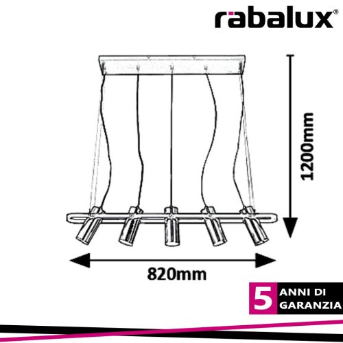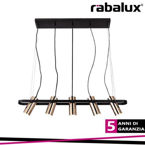 Lampada sospensione Raven.Consigliamo la sospensione a cinque luci Raven a chi, quando si tratta di arredare la propria casa, non si lascia sorprendere da soluzioni cool e sorprendenti. Il design del ciondolo Raven realizzato in stile industriale in una combinazione di colori nero opaco e oro, non è affatto ordinario. L'apparecchio di illuminazione in metallo della lampada, dotato di una base decorativa rettangolare nera opaca, è completato da paralumi cilindrici oblunghi anch'essi in metallo. Le cinque teste di lampada dorate sono incorniciate da un elemento ovale allungato. Il ciondolo che emette una luce bianca calda sarà un'aggiunta elegante agli interni del tuo soggiorno moderno. Le sorgenti luminose a LED integrate di Raven hanno una potenza totale di 25 W, un'intensità luminosa di 2000 lumen e una temperatura di colore di 3000 K. La larghezza della lampada è di 820 mm e la sua distanza dal soffitto è di 1200 mm .CARATTERISTICHE DEL PRODOTTO:categoria di prodotto=Illuminazione interna:Tipo=Pendenti:Stile=Industriale:Camera=soggiorno, stanza di lavoro:Flusso luminoso della sorgente luminosa (lm)=2000:Specifiche della sorgente luminosa=25W:Tecnologia LED=sì:Protezione IP=IP20:Colore della lampada=oro:Materiale della lampada=metallo:Durata della sorgente luminosa (h)=25000:Classe energetica sorgente luminosa=F:Garanzia (anni)=5:Consumo energetico ponderato (kwh/1000 Ah)=25.0:Specifiche dell'apparecchio di illuminazione=LED 25W:Tensione applicata=230V, 50Hz:Distanza dal soffitto=1200.0:Orizzontale (mm)=820.0:Dimensioni=820X1200MM:Peso netto (kg)=1.74:Peso lordo=1.94:Temperatura colore (K)=3000:Cavo tessile=sì:Classe di protezione=I