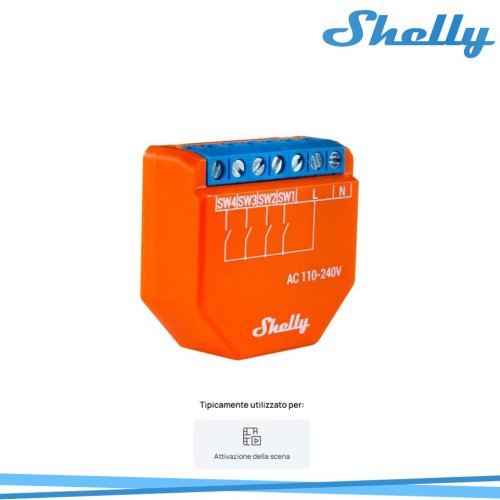 Shelly i4 Gen3.Controller intelligente a 4 canali, alimentato a corrente alternata, che consente di attivare o disattivare qualsiasi scena creata, eseguire azioni sincronizzate o eseguire scenari di attivazione complessi.Caratteristiche principali.Multi-clic - Fino a 16 azioni possibili.Nuovo processore: chip ESP-Shelly-C38F con memoria aumentata di 8 MB.Maggiore durata dei terminali.Supporta scripting, webhook, MQTT, WebSocket, HTTPS, UDP, TLS e certificati personalizzati.Nessun HUB richiesto! Controllo semplice tramite l'app Shelly Smart Control, diversi protocolli e piattaforme di domotica..Supporta la comunicazione KNXnet/IPSpecifiche:Dimensioni (AxLxP):=37x42x16 / 1,46x1,65x0,63:Peso:=19 g:Coppia massima dei terminali a vite:=0,4 Nm:Sezione trasversale del conduttore:=Da 0,2 a 2,5 mm² (conduttori rigidi, flessibili e a calza):Lunghezza spelata del conduttore:=da 6 a 7 mm:Montaggio:=Scatola da muro:Materiale della calotta:=Plastica:Colore della conchiglia:=Arancia:Colore terminale=Nero:Temperatura ambiente di lavoro:=da -20 °C a 40 °C / da -5 °F a 105 °F:Umidità:=30% al 70% di umidità relativa:Altitudine massima:=2000 m:Alimentazione elettrica:=110 - 240 V 50/60 Hz:Consumo energetico:=< 1 W:Sensore di temperatura interna:=SÃ:Protocollo:=802.11 b/g/n:Banda RF:=2401 - 2483 MHz:Potenza RF massima:=< 20 dBm:Allineare:=Fino a 30 m/100 piedi all'interno e 50 m/160 piedi all'esterno (dipende dalle condizioni locali):Bluetooth=Si:Protocollo:=4.2 con BLE:Banda RF:=2400 - 2483,5 MHz:Potenza RF massima:=< 4 dBm:Allineare:=Fino a 10 m/33 piedi all'interno e 30 m/100 piedi all'esterno (dipende dalle condizioni locali):Manuale=Clicca Qui
