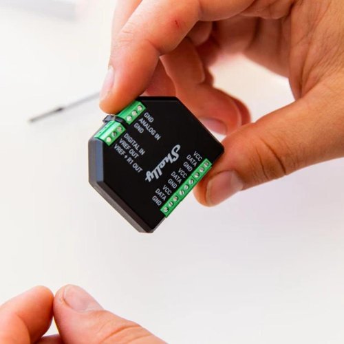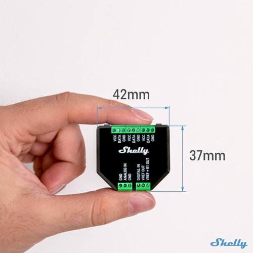 Componente aggiuntivo Shelly Plus.Interfaccia sensore galvanicamente isolata per tutti i relè Shelly Plus. Utilizzala per misurare temperatura e umidità o per collegare vari sensori analogici e digitali. Compatibile anche con la maggior parte dei sensori Arduino!Caratteristiche principali.Può essere utilizzato con un massimo di cinque sensori DS18B20 o un sensore DHT22.Ha un ingresso analogico e uno digitale.DS18B20 - Sensore di temperatura (fino a 5) selezionare la variante del prodotto con o senza (la variante predefinita viene spedita senza).Sensore DHT22: se si desidera monitorare la temperatura e l'umiditàSpecifiche:Dimensioni (AxLxP):=37x42x15 ±0,5 mm:Pesare:=105 g:Materiale della calotta:=Plastica:Coppia massima dei terminali a vite:=0,1 Nm:Sezione trasversale del conduttore:=massimo 1 mm²:Lunghezza spelata del conduttore:=4,5 mm:Colore:=Nero:Temperatura ambiente:=da -20 °C a 40 °C:Umidità=30% al 70% di umidità relativa:Altitudine massima=2000 m / 6562 piedi:Tensione di alimentazione CA:=N / A:Tensione di alimentazione DC:=3,3 V (dal dispositivo Shelly plus):Consumo energetico:=< 0,5 W (senza sensori):Corrente massima VCC:=10 mA:Corrente massima VREF OUT:=1 mA:Resistore VREF+R1 OUT=10 kΩ:Dispositivi supportati dall'add-on Shelly Plus:=Shelly Plus 13:00=Shelly Plus 1/1PM UL=Shelly Plus 14:00=Shelly Plus 14:00 UL=Shelly Plus i4/i4DC=Shelly Plus 0-10V Dimmer PM=Shelly Plus RGBW PM=Shelly 1/1PM Gen3=Shelly 2PM Gen3=Shelly i4 Gen3=Dimmer Shelly DALI Gen3=Dimmer Shelly 0/1-10V PM Gen3=Shelly EM Gen3=Shelly 1 Gen4=Shelly 1PM Gen4:Lettura della temperatura:=Dipende dai sensori DS18B20 o DHT22:Lettura dell'umidità:=Dipende dal sensore DHT22:Ingresso digitale:=Da -15 V a 0,5 V (vero)/da 2,5 V a 15 V (falso)*:Intervallo di ingresso analogico:=Da 0 a 100%:Soglia del report di ingresso analogico:=1%**:Gamma del voltmetro:=Da 0 a 10 V:Soglia del rapporto del voltmetro:=0,1 V**:Precisione dell'ingresso analogico/voltmetro=Migliore di ±5%:Manuale=Clicca Qui