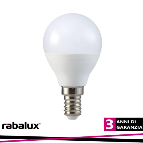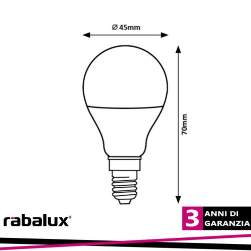 Lampadina E14 G45Caratteristiche del prodotto:Categoria=Sorgenti luminose:Tipo=Lampadina LED:Temperatura del colore=bianco freddo:Flusso luminoso della sorgente luminosa (lm)=470:Specifiche della sorgente luminosa=5W:Tecnologia LED=sì:Protezione IP=IP20:Colore della lampada=bianco:Materiale della lampada=plastica:Materiale del paralume=plastica:Durata della sorgente luminosa (h)=20000:Classe energetica della sorgente luminosa=F:Garanzia (anni)=3:Angolo di illuminazione=180:Consumo energetico ponderato (kwh/1000 Ah)=5.0:Tipo di portalampada=E14:Tensione applicata=230V, 50Hz:Verticale (mm)=70.0:Diametro (mm)=45.0:Misura unica della scatola X (cm)=4.5:Misura unica della scatola Y (cm)=7.2:Misura unica della scatola Z (cm)=4.5:Peso netto (kg)=0.01:Peso lordo=0.01:Temperatura del colore (K)=6500:Wi-Fi=no:Forma della sorgente luminosa=G45:Campo di funzionamento ideale=-20°C-40°C