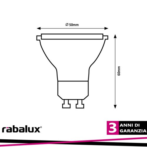Lampadina GU10 7WCaratteristiche del prodotto:Categoria di prodotto=Lampadina:Tipo=Gu10:Temperatura del colore=bianco calda:Flusso luminoso della sorgente luminosa (lm)=800:Tecnologia LED=SÃ:Protezione IP=IP20:Colore della lampada=bianco:Materiale della lampada=plastica:Materiale del paralume=plastica:Durata della sorgente luminosa (h)=15000:Classe energetica della sorgente luminosa=E:Garanzia (anni)=3:Angolo di illuminazione=100:Consumo energetico ponderato (kwh/1000 Ah)=7.0:PRESA=GU10:Tensione applicata=230V:Verticale (mm)=60.0:Diametro=50.0:Misura unica della scatola X (cm)=5.1:Misura unica della scatola Y (cm)=5.1:Misura unica della scatola Z (cm)=6.3:Peso netto (kg)=0,06:Peso lordo=0,07:Temperatura del colore (K)=3000:Dimmerabile=SÃ