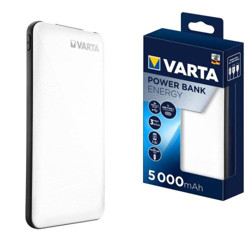 Varta Energy 5000 Power bank LiPo 5000 mAh 5797-5101111.La soluzione di ricarica compatta e affidabile per i viaggi. Le batterie Varta Energy Power Bank vi forniscono la giusta quantità di energia ovunque e in qualsiasi momento. Fino a 20.000 mAh e la possibilità di caricare 3 dispositivi contemporaneamente, tra cui una porta USB di tipo C..Power bank dotato di 4 attacchi (1x ingresso micro usb, 2x uscita usb a, 1x attacco bidirezionale usb tipo c).Tecnologia all'avanguardia: entrata e uscita usb tipo c 5v/ 2.4a per ricarica veloce fino a 15 watt.Design accattivante e decorato.Ideale per i viaggi: carica fino a 3 dispositivi contemporaneamente.Provvisto della "varta advanced safety technology" di nuova generazione.Dispositivi compatibili: Smartphone